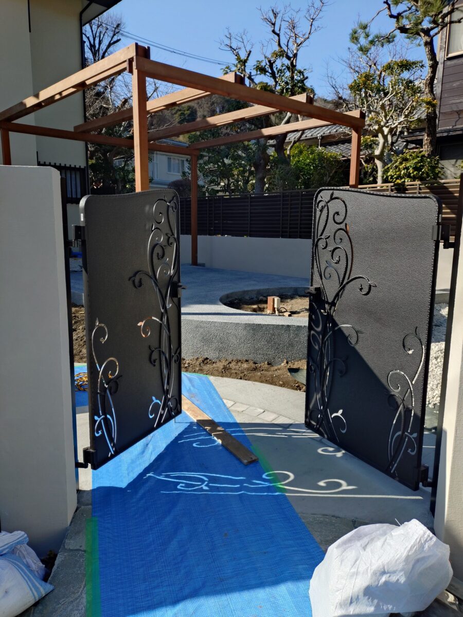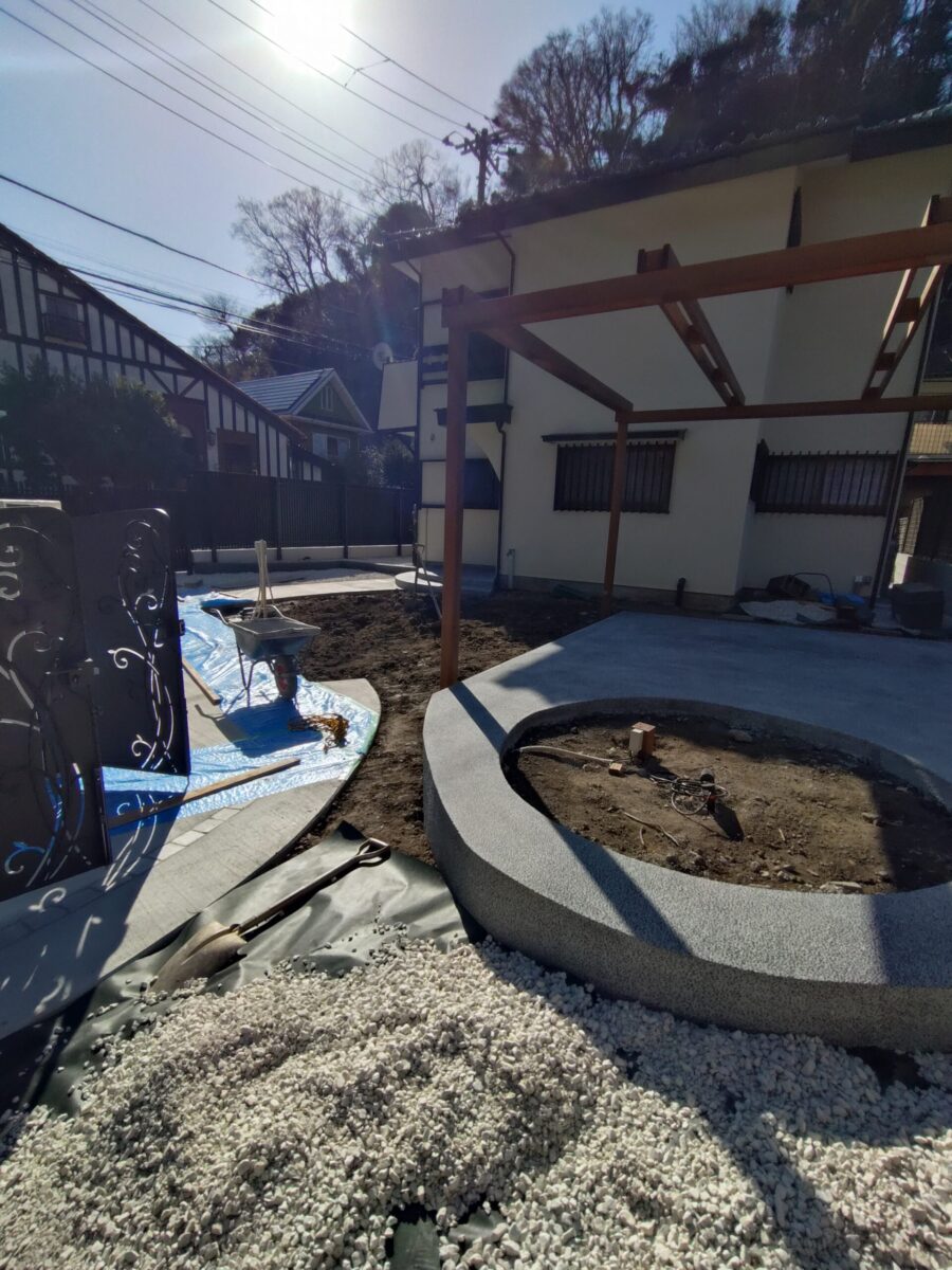 上部は藤棚になっており、いずれは美しい藤と花壇がお出迎えしてくれます。 春先の植栽工事が、今からとても楽しみです!