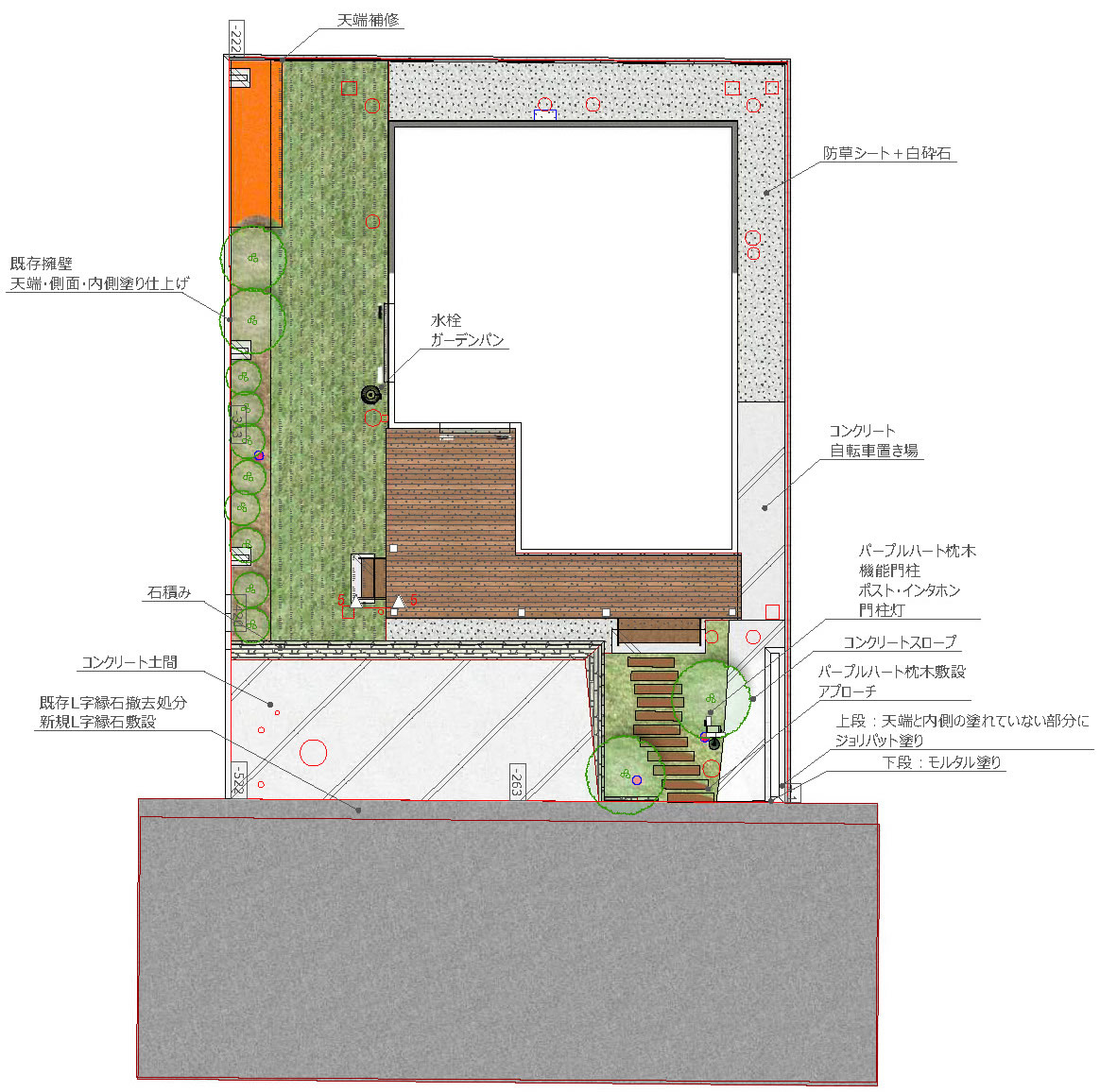 当社の造園設計には造園・外構専用CAD(RIKCAD)を使用しております。「どの様な庭にしたいか?」「完成したイメージ写真が見たい」とのご意見にも、このCADで一度図面を作成するだけでお応えできます。